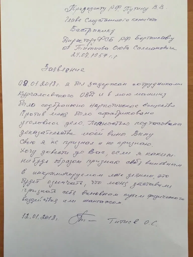 Арестованный на прошлой неделе глава чеченского представительства правозащитного центра «Мемориал» Оюб Титиев передал через своего адвоката заявление, адресованное президенту Путину, председателю СКР Бастрыкину и главе ФСБ Бортникову. Это заявление он написал еще в пятницу, по собственной инициативе. Приводим его дословно: