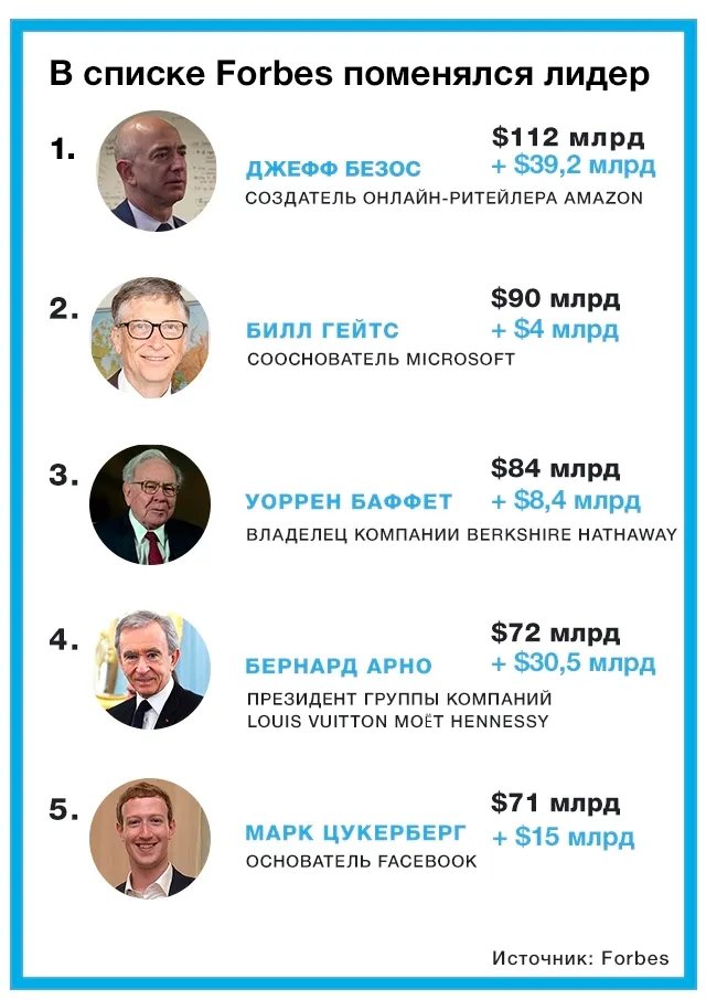 Журнал оценил состояние Безоса в $112 млрд и отметил, что за год оно выросло более чем на $39 млрд, что является самым большим скачком в размере состояния за всю историю. Состояние Гейтса Forbes оценил в $90 млрд, а Баффета — в $84 млрд.