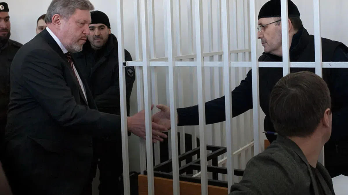 К половине двенадцатого Оюба Титиева все же доставили в суд. Его заводят в клетку, он оглядывает зал, улыбается. Здоровается за руку с Явлинским.
