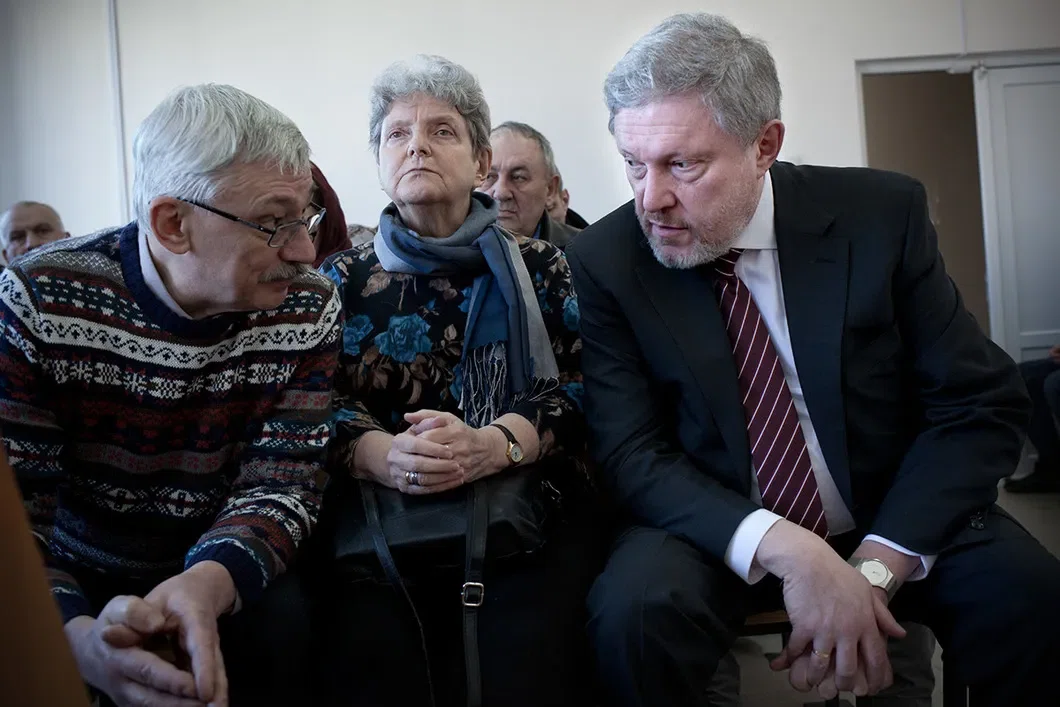 член правления Международного Мемориала Олег Орлов, председатель «Гражданского Содействия» Светлана Ганнушкина, кандидат в президенты Григорий Явлинский. Фото: Анна Артемьева / «Новая газета»