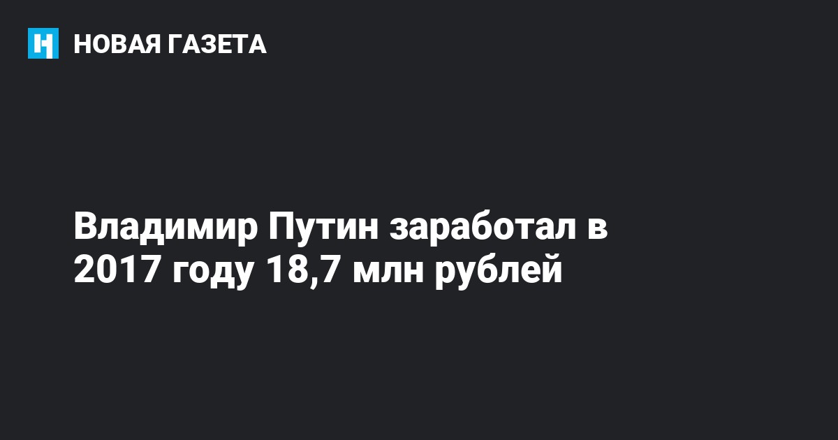 Президент России Владимир Путин в 2017 году заработал 18, 7 млн рублей, что на примерно 10 млн рублей больше, чем в 2016 году. Об этом следует из декларации доходов, опубликованной на сайте Кремля.
