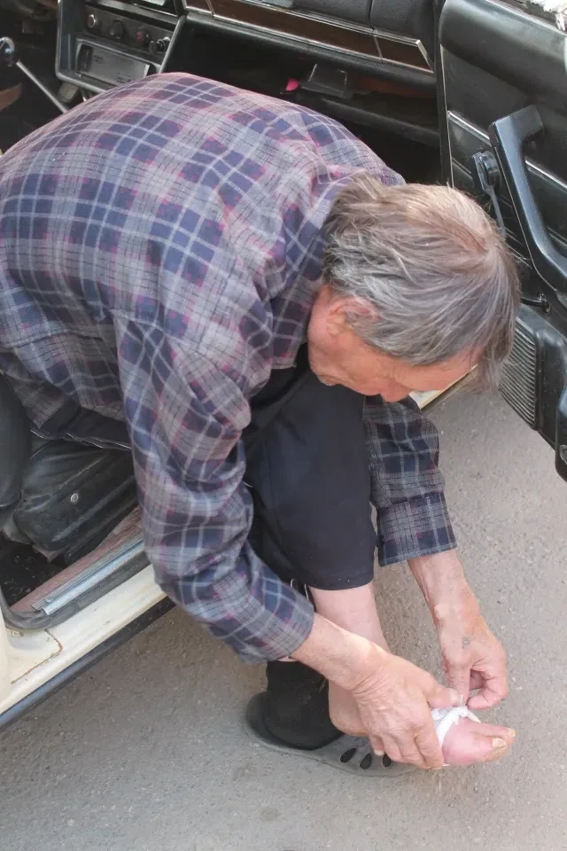 Пациент с гангреной сидит в бежевой «шестерке» на парковке супермаркета. В Саратов его привез односельчанин Женя. Глядя на разбитую «шаху», трудно поверить, что она смогла проехать 100 километров. «Меня снимать не надо, мне еще в нашем районе жить, — Женя закрывается от фотокамеры, — вы на ногу его поглядите». Распухшая нога еле помещается в резиновый сланец. Юрий стягивает носок, разматывает несвежий бинт. Воспаленная стопа с черными и гнойными пятнами выглядит ужасно.