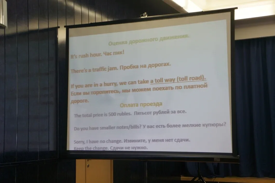 — …Это универсальная программа обучения, которая может быть приспособлена для всех — от руководителей до водителей, — рассказывал журналистам в обрамлении буквы «П» из столов в дальнем конце зала исполнительный директор «Транспортной Ассоциации Московской Агломерации» Норайр Блудян. Кратко прошелся по 8-часовому курсу, разработанному совместно с таксомоторным сообществом Москвы — от техзадания до специфики организации процесса перевозок — и выделил особо: — Важная часть — обучение водителей английскому. Мы понимаем контингент и уровень знания наших учеников, и с этим пониманием мы также разработали небольшой русско-английский разговорник.
