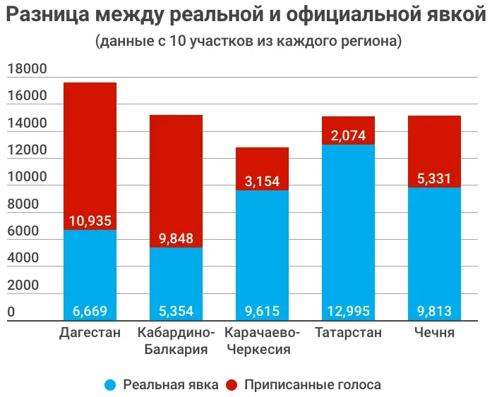 По подсчетам наблюдателей, на 10 участках Черкесска расхождение по явке составило 3154 голоса — немногим больше, чем только на одном участке № 1058 в Махачкале. Чистых участков не обнаружено.