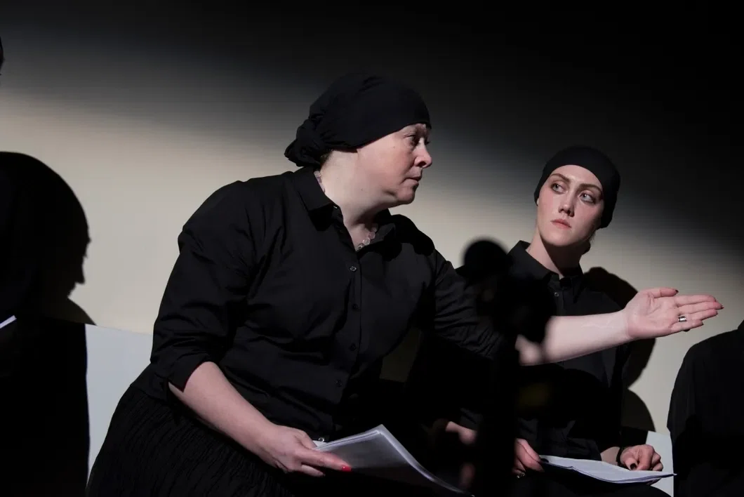 Три женщины в черных длинных платьях сидят на сцене. Лица опущены, черные платки закрывают лбы.