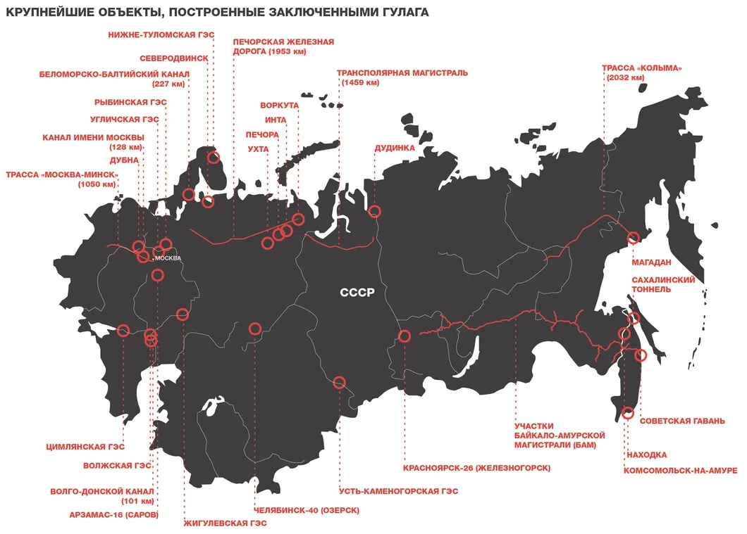 Все крупнейшие гидроэлектростанции начинались с Главгидростроя ГУЛАГа. Города Комсомольск-на-Амуре, Советская Гавань, Находка, Магадан, Дудинка, Воркута, Ухта, Инта, Печора, Молотовск (Северодвинск), наукоград Дубна — построены заключенными.