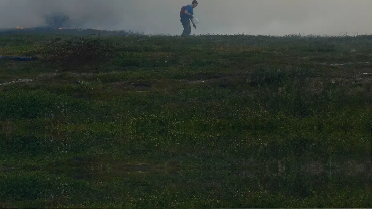 — Мы вообще из Кильдинстроя (поселок в 125 км от Териберки), нам вызов пришел, командир говорит, езжай — посмотри. Ну и поехали. Мы и вчера здесь были, только не тушили, — говорит начкар. В футболке и подвернутых штанах он неотличим от волонтеров и сейчас тушит вместе с ними. У всех четверых пожарные рюкзаки да лопаты. Огонь змеей вьется по тундре на сотни метров. Ветер меняется, становится все сильнее. Огонь ширится, идет на людей. Люди уходят в дым. Возвращаются, отплевываясь и вытирая пот, набирают еще воды и снова тащатся в гору свои 300 метров — до первых языков пламени. Под ногами у них горит земля. Ни противогазов, ни респираторов, конечно, нет. Глаза слезятся, порывы ветра поднимают облака пепла.