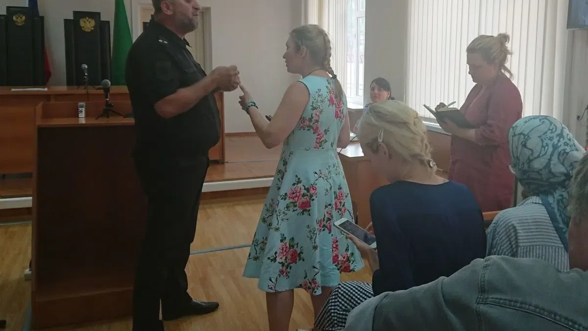 Не находя других аргументов в этом споре, «номер 03090» попытался даже хватать Лену за руки, чтобы вытащить из зала. На шум в помещение вбежали коллеги пристава. Одна из его коллег с порога бросилась в бой: