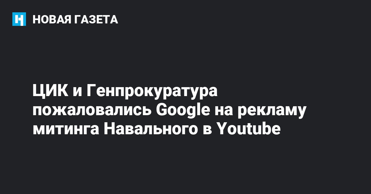 Ряд российских ведомств написали письмо главному исполнительному директору Google Ларри Пейджу, где потребовали прекратить размещать рекламу Алексея Навального на Youtube с призывом прийти на митинг 9 сентября. По данным «Ведомостей», письма отправили Центральная избирательная комиссия (ЦИК), Генпрокуратура, Федеральная антимонопольная служба и Роскомнадзор.
