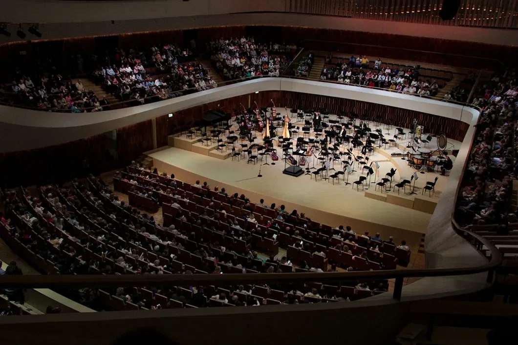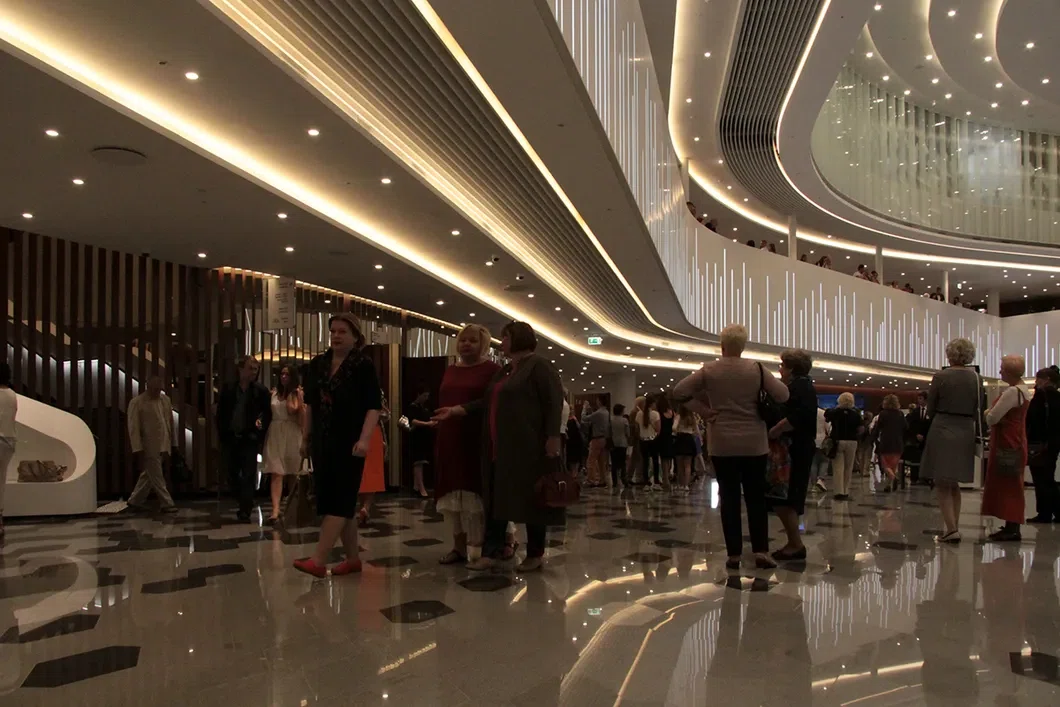 Сначала мы с другими женщинами на шпильках увлеченно играли в квест «Найди бельэтаж или амфитеатр» — трансформирующие механизмы могут превращать пространство из одноуровневого в поступенчатое за 40 минут, поэтому здесь обещают и джаз, и эстраду, и форумы, и даже балы. Потом я сидела на бельэтаже, португалец — в партере за оркестром, лицом к Михаилу Плетневу и спиной к собранному вручную по старинным технологиям органу. Струился волнами зал, пела Татьяну из «Евгения Онегина» Красимира Стоянова, и мы слушали в окружении акустических панелей с содержанием дерева «махагони» — лучшего материала для реверберации и отражения звука. Под потолком, в пространство над которым спрятано все звуковое оборудование и подвесы, что позволяет проводить симфонические концерты без звукоусиления.