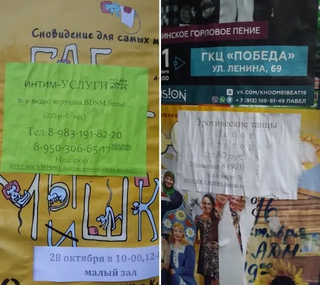 В правительственном квартале, в нескольких метрах от здания, где Верховный Совет, министерства, избирком, главный федеральный инспектор — афишная тумба. На ней — остатки политагитации, а прямо по мордам глянцевых кандидатов, задумавшихся о Хакасии, расклеены многочисленные свидетельства прозрачной нищеты республики, фантастического демпинга: реклама интим-услуг (все, что хочешь и круглосуточно — BDSM, «игрушки», «белье») — 200 рублей / час; «эротические танцы любой категории» — 50 рублей, скидки; «куплю вашу семенную жидкость» и т.д.