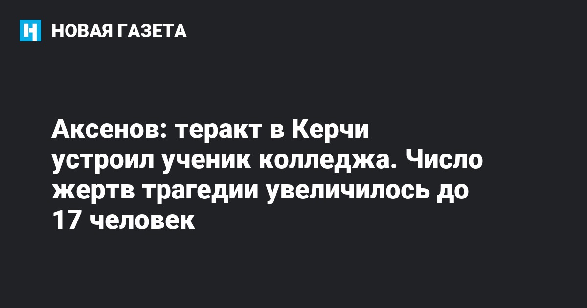По его словам, после теракта этот 22-летний житель Керчи покончил с собой, а мотив его действий устанавливается. Аксенов также заявил, что число жертв возросло до 18 человек, по информации Следственного комитета (СК), 17 человек.