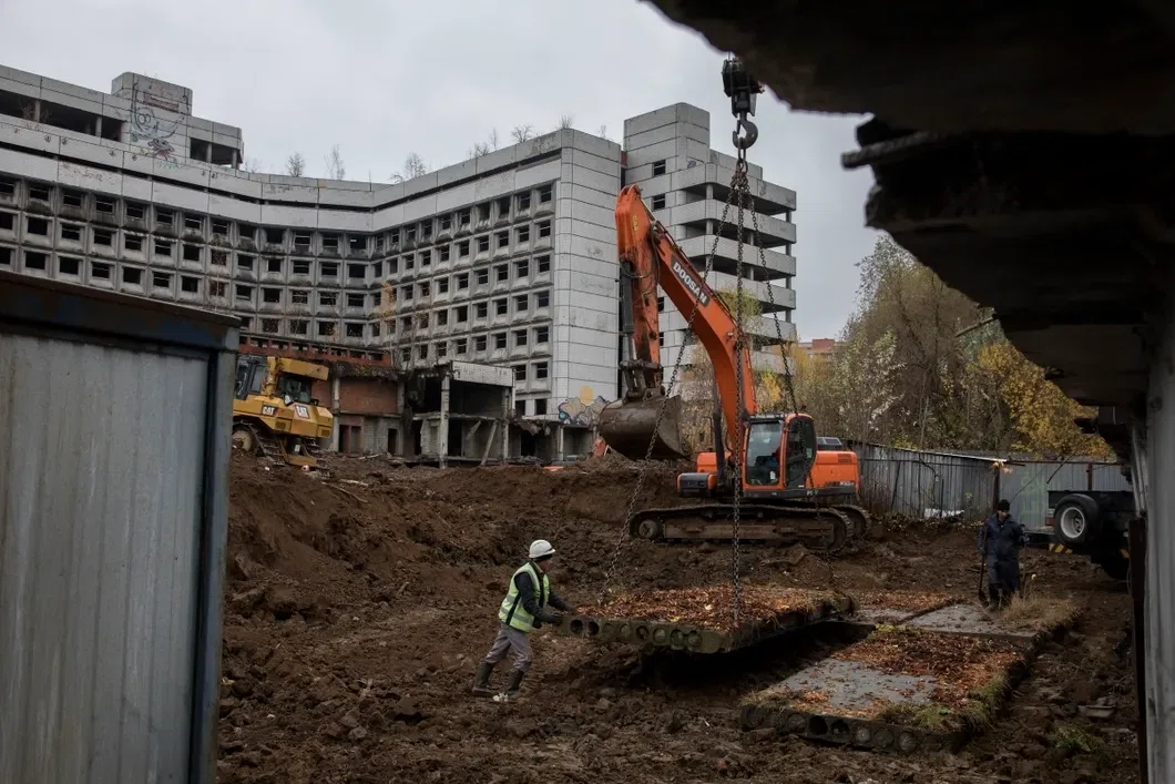В бюрократических кабинетах начались имущественные споры о том, кому принадлежит здание. К середине нулевых объект полностью достался городу. Власти думали еще десятилетие, пока окончательно не определились, что достраивать ХЗБ бесполезно — надо сносить. На то, чтобы решить, как это делать (гуляла версия, что больницу хотели взорвать, но рядом столько жилых домов, что потом замучаешься всем новые стекла вставлять), у города ушло еще несколько лет. И вот экскаваторы пошли на здание.