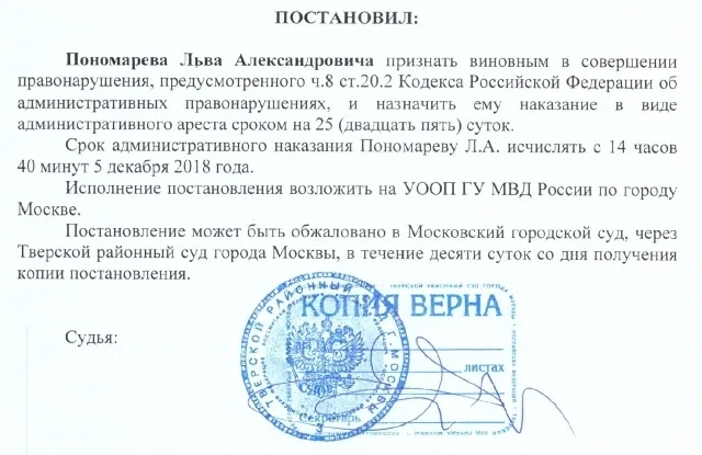 - Копия вступившего в силу постановления Тверского суда г. Москвы от 31 июля 2018 г., которым Пономарев был признан виновным по ч.5 ст.20.2 КоАП («Нарушение установленного порядка организации либо проведения собрания, митинга, демонстрации, шествия или пикетирования») и приговорен к штрафу.