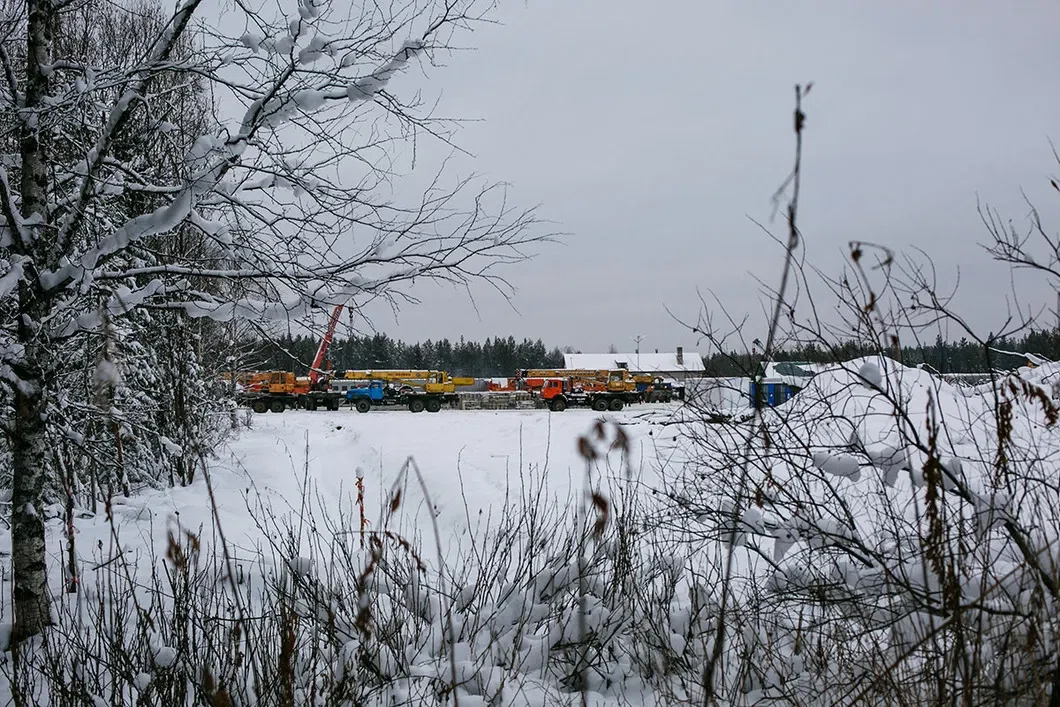 Основная стройплощадка находится у станционной конторы. Там ссыпаны горы щебня и песка. С подходящих платформ сгружают все те же плиты. За зданием станции ими выложен плац площадью с пару футбольных полей. Рабочие, как солдаты, меланхолично скалывают и сметают с него наледь. Здесь десятки самосвалов и автокранов, вертолетная площадка, двухэтажное модульное общежитие (активисты утверждают, что оно на винтовых сваях, то есть капитальное). Еще дальше — вырубка, которую затруднительно измерить даже в футбольных полях. Если верить официальным цифрам, общая площадь полигона составит 300 гектаров.