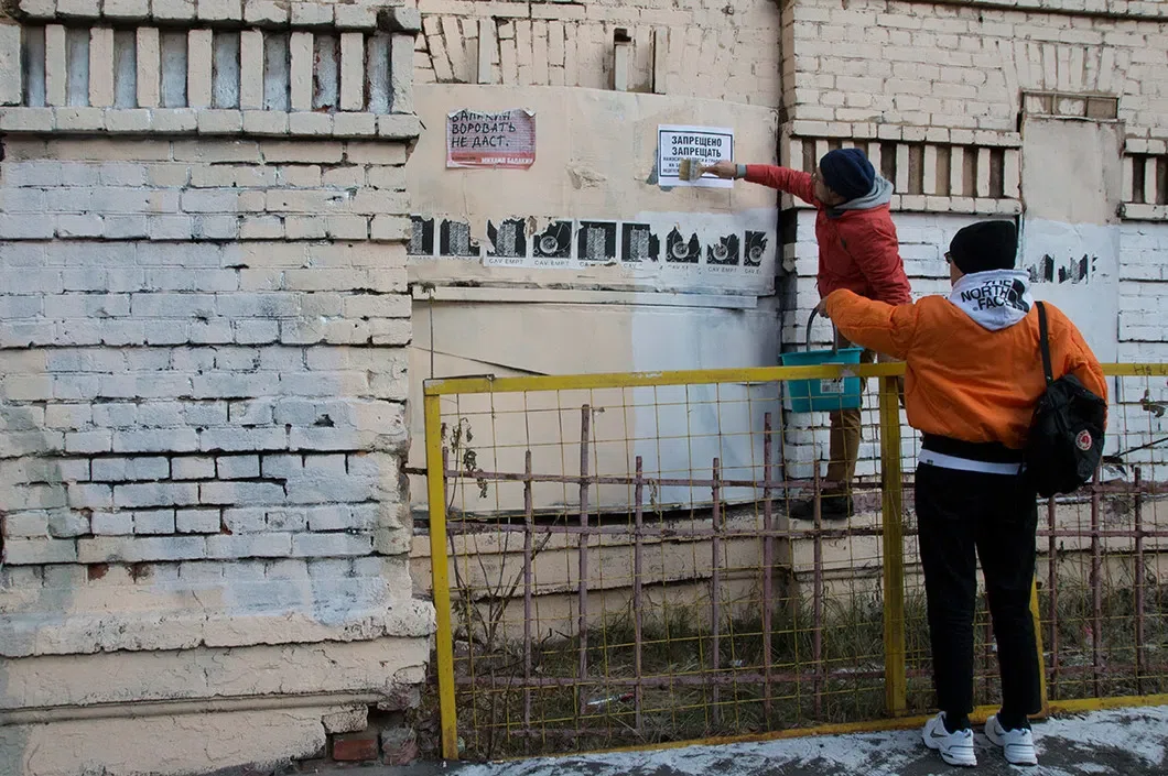 — Это было легендарное место — стена, на которой тоже всегда были граффити. Прохожие останавливались посмотреть, фотографировались. Видите, что этим летом сделали? — Антон окунул кисточку в клей и достал из кармана листовку: «Запрещено запрещать наносить надписи и граффити на заборе и стене здания. Ведется гражданское наблюдение!»
