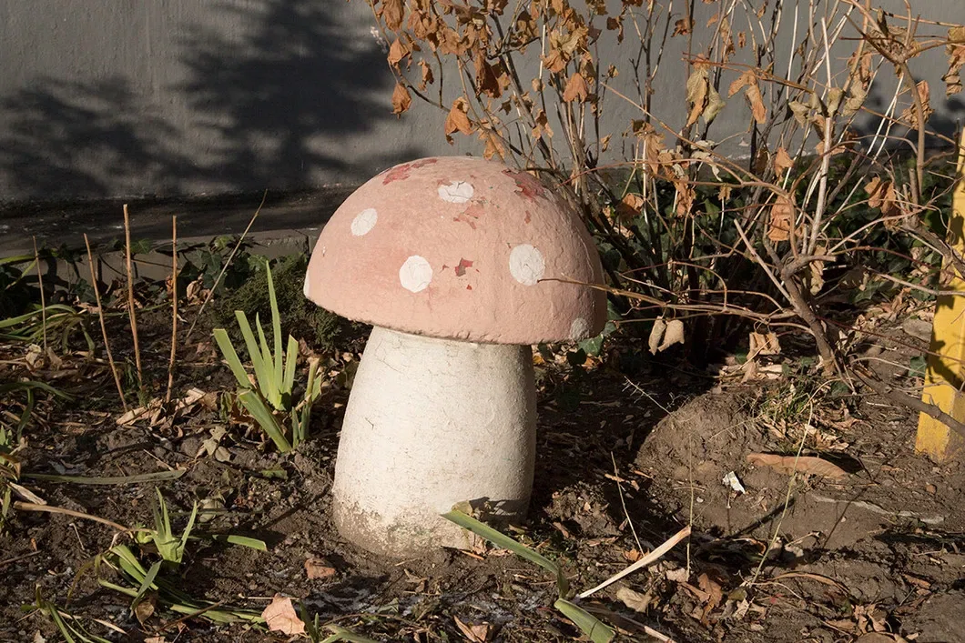 По дороге мы остановились у натыканных в землю внушительных деревянных грибов. На грибах сидели довольные дети.