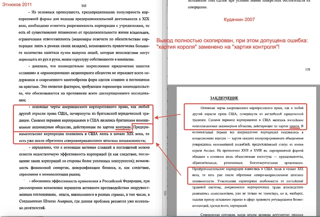 Открытие «Контроля Англии» полковник Этнюков делает в выводах своей диссертации на стр. 163. Копируя работы других ученых, посвященные американскому корпоративному праву, он делал это настолько бездумно и размашисто, что осмысленная фраза «Самыми первыми корпорациями в США являлись английские колонизационные акционерные общества, действующие по хартии короля» превратилась в ахинею: