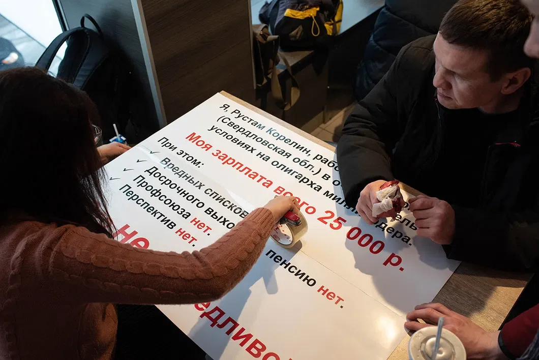 — Сейчас у нас 20 человек из 800 работающих на предприятии. При этом неофициально нас поддерживают чуть ли не все рабочие, кроме начальства. Люди подходят и говорят: «Парни, как только встанете на две ноги — мы к вам», — рассказывает Корелин. — В прошлом году, в декабре, мы проводили митинг за повышение зарплат и снижение возраста выхода на пенсию. Пришли 40 рабочих. Постепенно люди перестают бояться, подтягиваются.