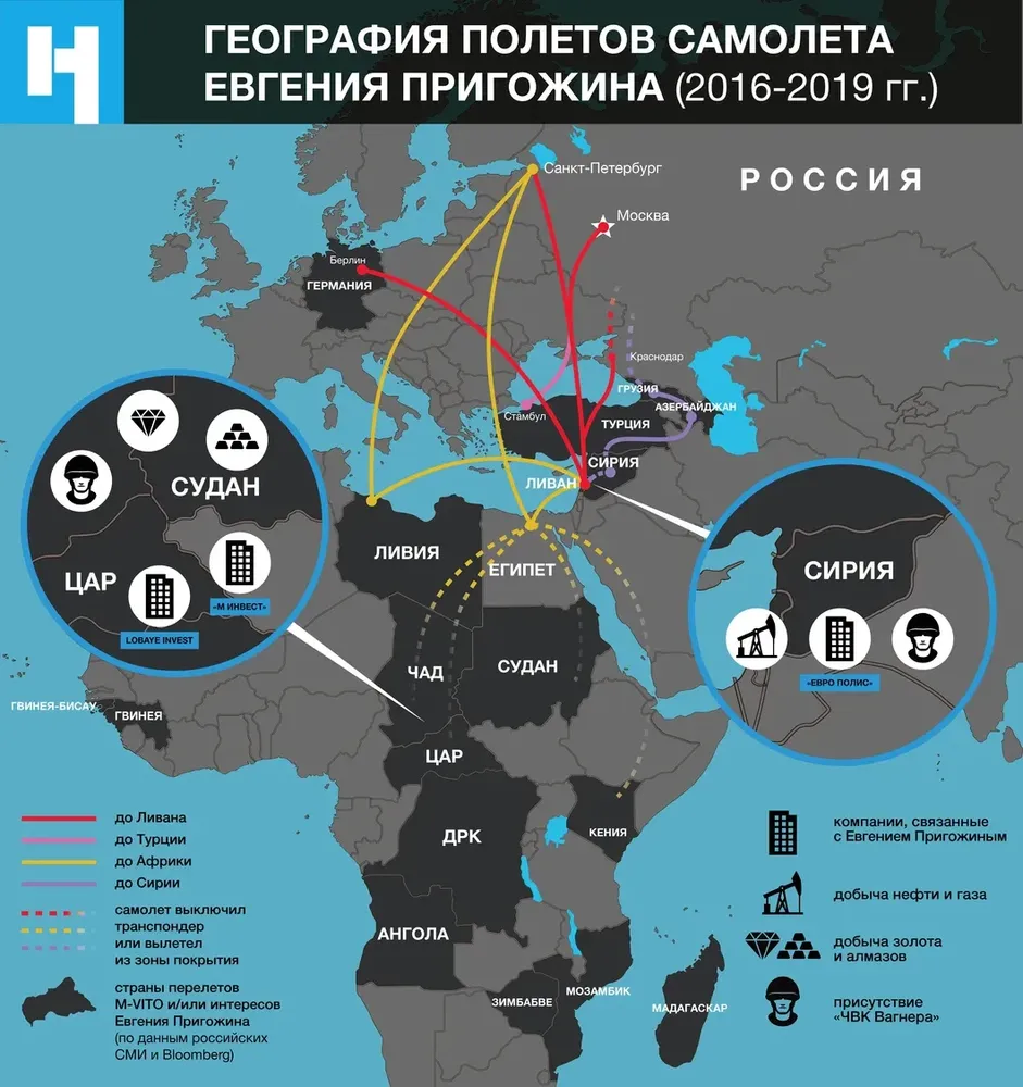 Интересы России в Африке, которые в том числе обеспечивают структуры Пригожина, по данным расследования Bloomberg, затрагивают десять африканских государств: ЦАР, Судан, Ливия, Мадагаскар, Ангола, Гвинея, Гвинея-Бисау, Мозамбик, Зимбабве и Демократическая Республика Конго. Все эти страны объединяет не только напряженная политическая обстановка (гражданские войны, военные перевороты и вооруженные конфликты), но и богатство природными ресурсами. Помимо подписания договоров о военном сотрудничестве, российские компании заключают с правительствами этих стран соглашения о разведке и добыче полезных ископаемых. Евгений Пригожин играет в этих процессах не последнюю роль.