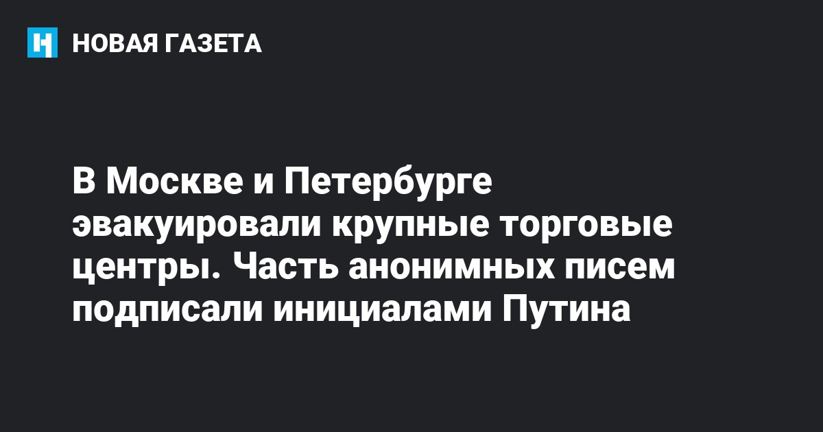 И в Москве, и в Петербурге, как узнала «Фонтанка», анонимные электронные письма были подписаны инициалами президента Владимира Путина. Если петербургским торговым центрам отправляли короткие сообщения «ТЦ заминирован», то московским написали: «Поздравляем Вас, здание заминировано взрывным устройством номиналом на 600 килограмм тротилового эквивалента, и устройство начинено металлической дробью».