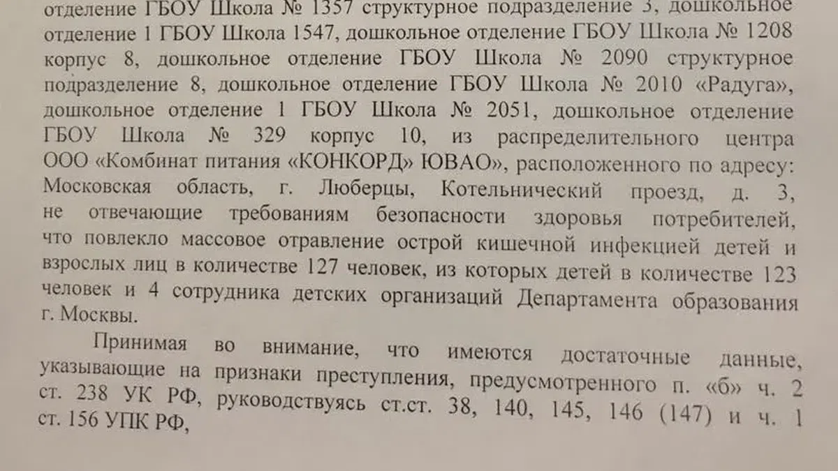 Вечером 21 февраля от представителя родительской общественности Екатерины Ковалевой мне стало известно, что управление СК РФ по Москве возбудило уголовное дело в отношении ООО «Комбинат питания «Конкорд» ЮВАО» по факту заражения детей дизентерией через питание в детском саду.