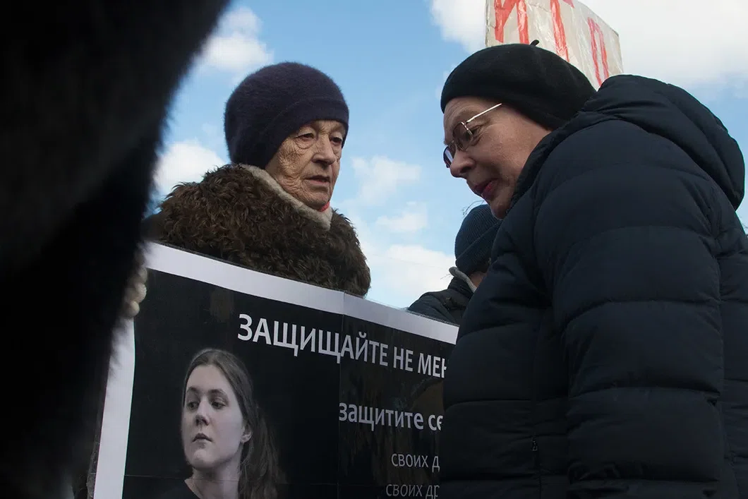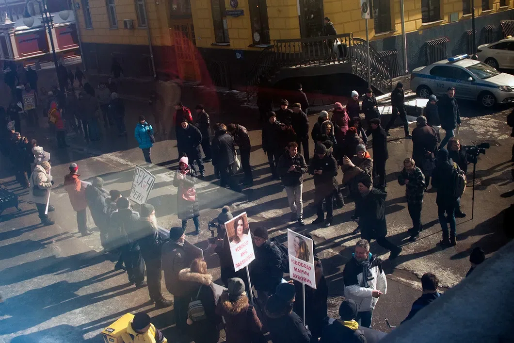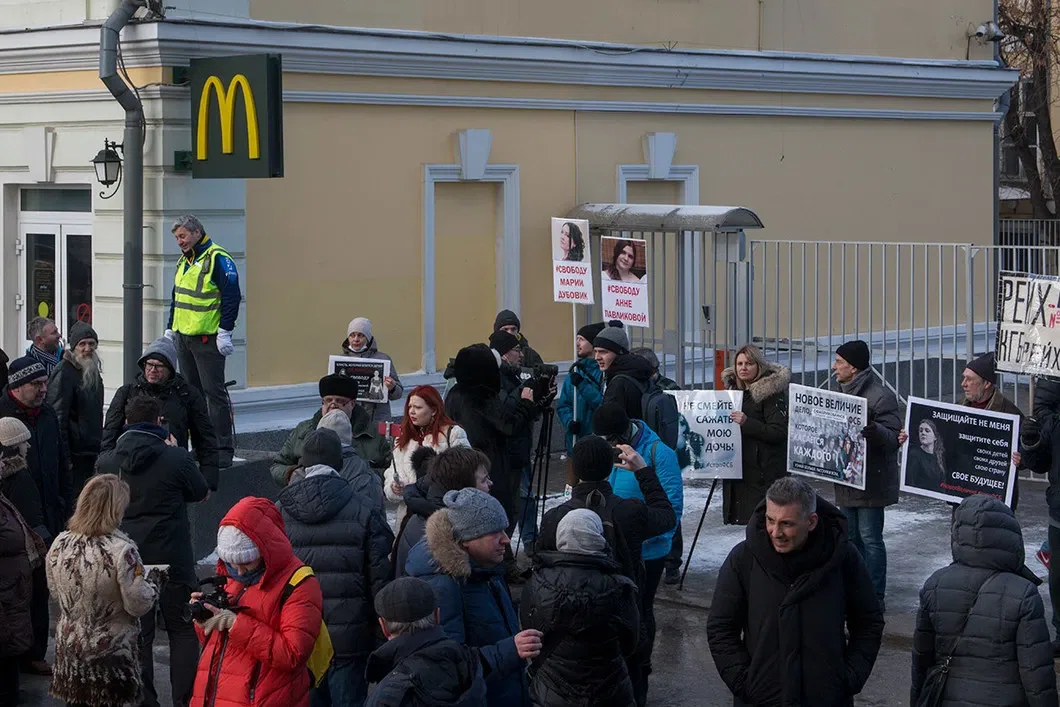 Холод жуткий, последние удары зимы. Тридцать человек выстроились цепью вдоль Климентовского переулка с лозунгами: «Власть, которая боится детей, обречена», «Вы гуляете, они сидят!», «Я жертва провокации ФСБ, кто будет следующей жертвой?». Сбоку, ближе к «Макдоналдсу», стоит женщина с палочкой. В руке плакат: «Не смейте сажать мою дочь!» Это Юля, мать Ани Павликовой.