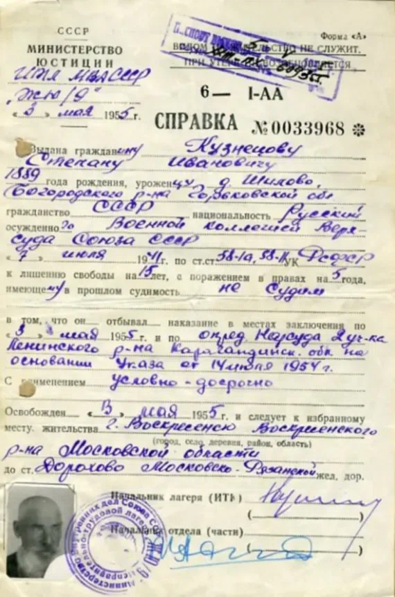 Степан Кузнецов попал в репрессивную машину как проходивший по «делу харбинцев», в рамках которого были репрессированы тысячи русских эмигрантов из Китая. В 30-е годы он служил на Китайско-Восточной железной дороге, и после возвращения на родину был арестован по доносу соседки по коммунальной квартире, которая написала в органы, что он якобы привез незаконно из Китая крупную сумму денег. Денег при обыске не нашли, но деда от репрессий это не спасло.