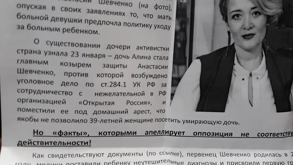 «Сторонники несистемной оппозиции во главе с олигархом Михаилом Ходорковским раздули скандал по поводу гибели дочери активистки Анастасии Шевченко (на фото), опуская в своих заявлениях то, что мать больной девушки предпочла занятие политикой уходу за больным ребенком», — текст листовки повторяет сюжет информационного агентства РИАФАН и сайта Народного освободительного движения.