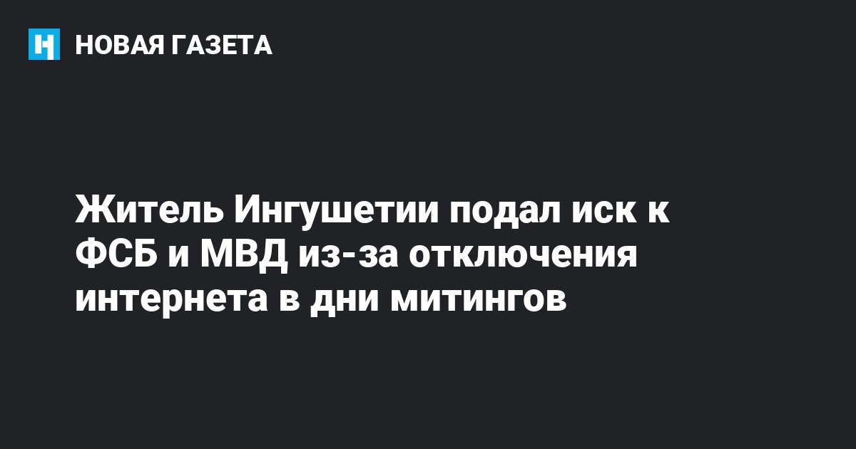 Житель Ингушении Мурад Хазбиев подал в Магасский районный суд иск к ФСБ и МВД из-за отключения интернета в республике во время акций, сообщают «Ведомости».