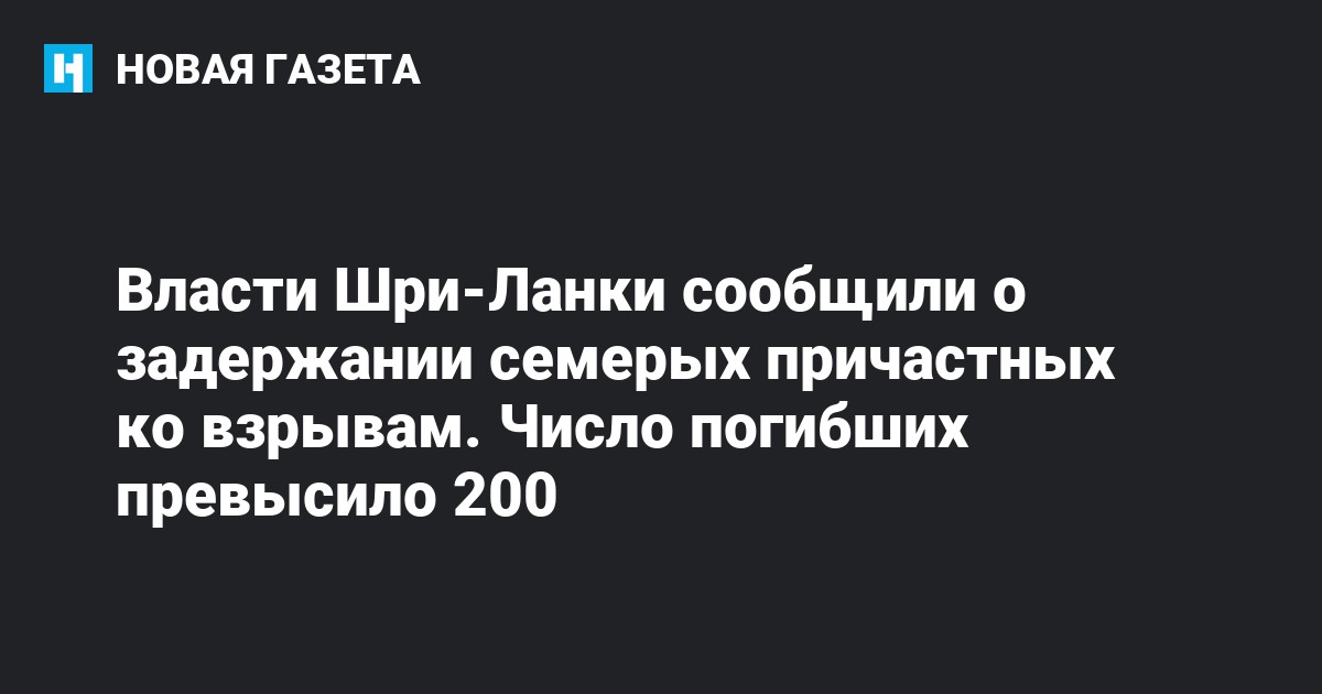 Министр обороны Шри-Ланки Руван Вийевардене объявил о задержании семерых человек, причастных к серии взрывов в церквях и отелях страны. Об этом написала в твиттере журналистка NYT Дхариша Бастианс. Число погибших, как заявили в полиции, достигло 207 человек, еще около 450 раненых.