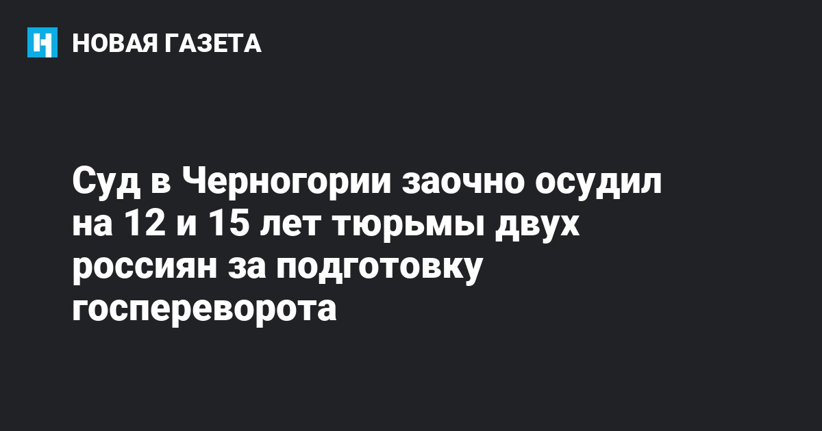 Высший суд Черногории заочно приговорил двух россиян Эдуарда Шишмакова и Владимира Попова к 15 и 12 годам лишения свободы соответственно по делу о попытке государственного переворота, сообщает Русская служба «Би-би-си». Лидеры «Демократического фронта» Андрия Мандич и Милан Кнежевич осуждены на пять лет каждый.