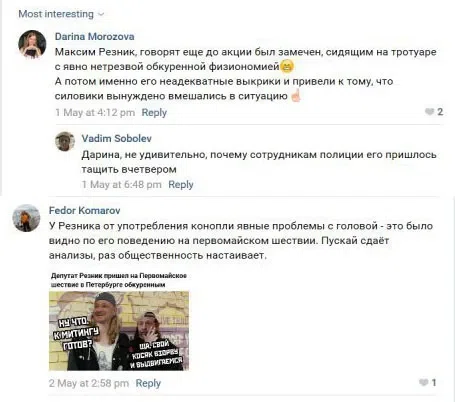 Аналогичные тезисы распространяли ВКонтакте пользователи, чьи аккаунты имеют все признаки фейковых (ранее «Новая в Петербурге» рассказывала том, что сотрудники штаба врио губернатора Александра Беглова ведут активную пиар-кампанию в соцсетях. —Ред.). Под постами о событиях на первомайском шествии «Новая» обнаружила сотни комментариев людей, возмущенных поведением «провокаторов-оппозиционеров», в особенности депутата Резника. «Максим Резник, говорят, еще до акции был замечен сидящим на тротуаре с явно нетрезвой обкуренной физиономией. А потом именно его неадекватные выкрики и привели к тому, что силовики вынужденно вмешались в ситуацию»; «Я думаю, что Резник вообще не особо думал, когда совершал правонарушение, потому что был в хламину накуренный и первые минуты вообще не вывозил ситуацию» — такие комментарии оставляют люди, зарегистрировавшиеся в соцсети «ВКонтакте» в марте и апреле этого года, иногда в один и тот же день. К слову, комментарии этих же пользователей можно найти под постами о работе Александра Беглова: обычно они выражают поддержку начинаний врио губернатора и хвалят его за достижения.