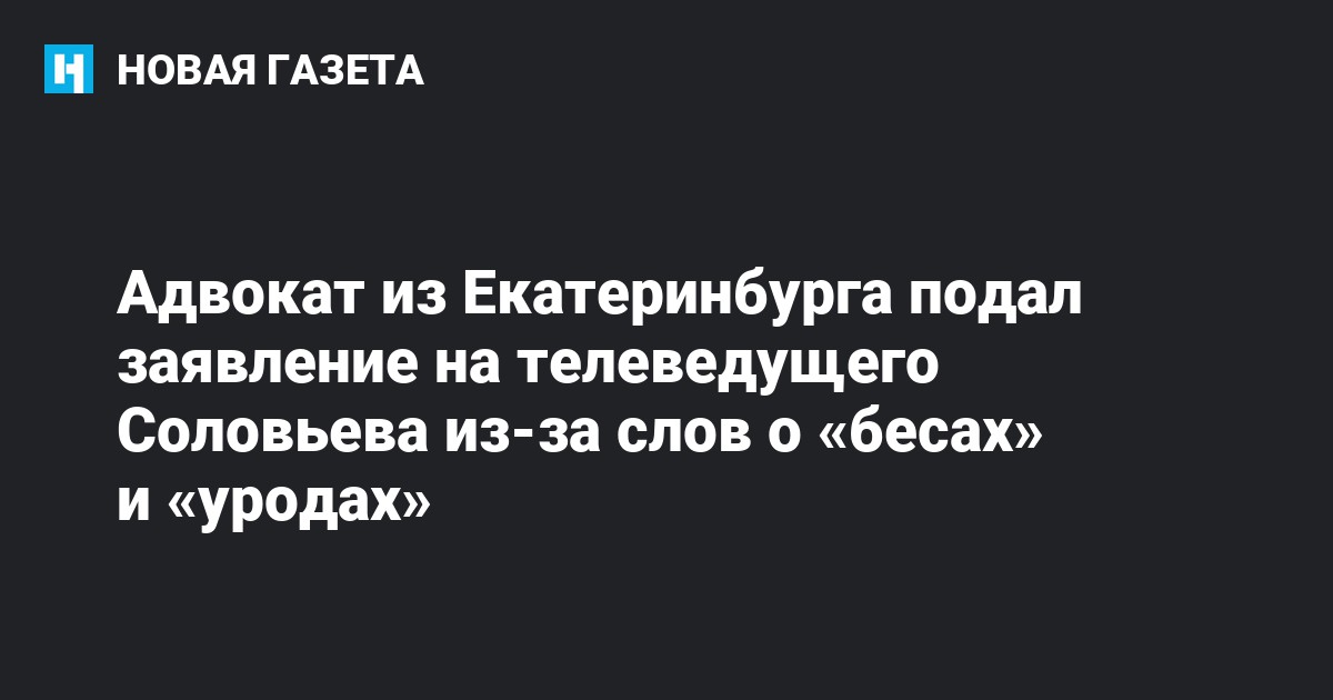 Екатеринбургский адвокат Андрей Бельянский обратился в Генеральную прокуратуру из-за слов телеведущего Владимира Соловьева об участниках акций в защиту сквера. Об этом он сам рассказал «Новой газете».