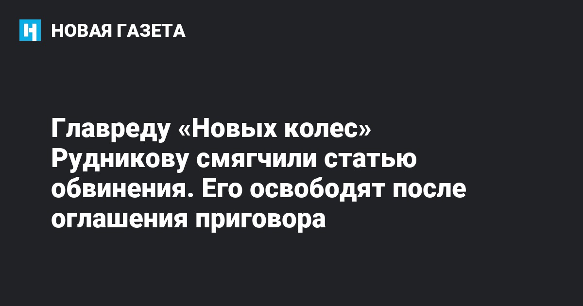 Московский районный суд Петербурга переквалифицировал статью обвинения основателю и главреду калининградской газеты «Новые колеса» Игорю Рудникову с вымогательства на самоуправство (ст. 330 УК), которая не предполагает реального срока, сообщает «Медиазона». Его освободят в зале суда после оглашения приговора.