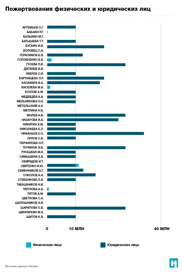 Можно заметить, что кандидаты от власти делятся на две группы: «гуляющие на свои» и «гуляющие на деньги юрлиц». На собственные деньги ведут избирательные кампании в основном новички — журналисты и бизнесмены, хотя в этой группе и три действующих депутата — председатель МГД Шапошников, глава австрийских единороссов Метельский (его избирательный фонд — всего 100 тысяч рублей) и депутат Перфилова. Наоборот, деньги юридических лиц получили в свои избирательные фонды в основном действующие депутаты МГД (хотя и тут есть исключения — например, космонавт Артемьев или ректор Русецкая). Особняком стоит телеведущая Мария Киселева, избирательный фонд которой целиком состоит из одного миллиона рублей пожертвований физических лиц.
