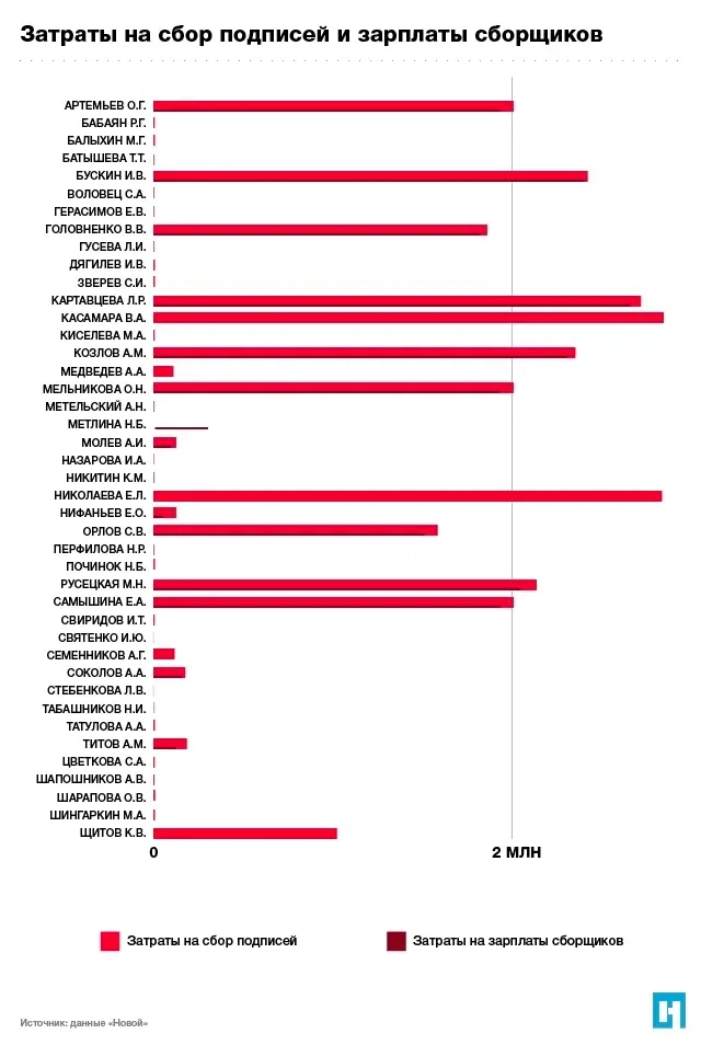 Немало удивили нас и отчеты о тратах из избирательных фондов. На данный момент все перечисленные в этом разделе «самомедвеженцы», кроме Соколова, зарегистрированы по подписям. С учетом стандартной цены сбора одной подписи в 300 рублей в нынешнем сезоне следует говорить о невозможности сбора подписей всеми, кто заявил меньше чем 1,2 миллиона рублей расходов на сборы подписей. 33 из 42 «самомедвеженцев» не могли собрать те подписи, которые заявили.