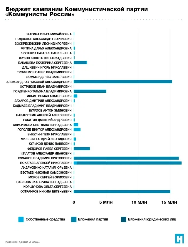Второе место по доле общего избирательного бюджета неожиданно занимает исторически малоизвестная и малоуспешная в Москве (ранее не участвовала ни в одних выборах депутатов МГД, на думских выборах 2016 года получила во всем городе всего 70 тысяч голосов) партия «Коммунисты России», которой на этих выборах удалось зарегистрировать по подписям 32 кандидата из 34 подавших документы.