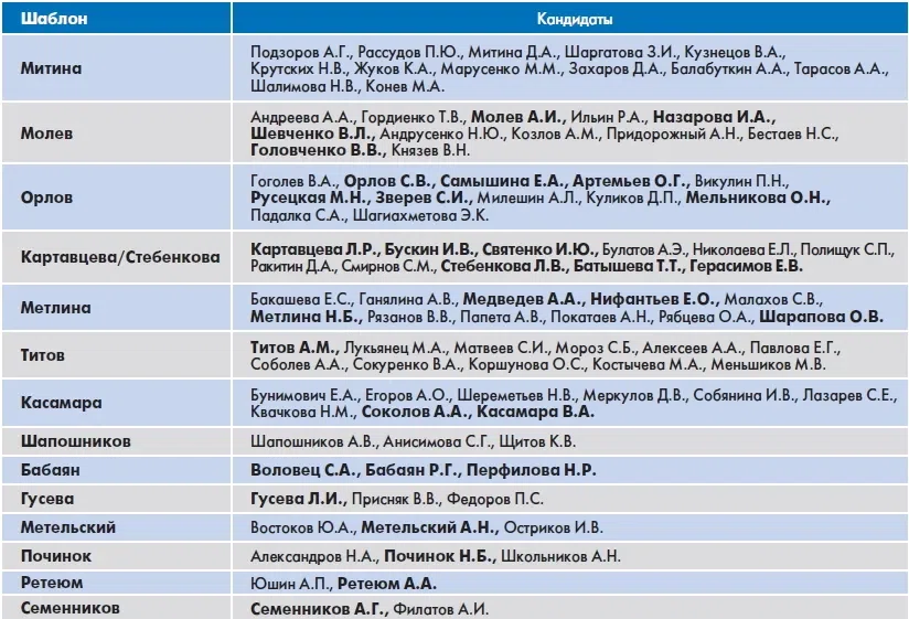 Отдельную категорию образуют «малые» шаблоны, использующиеся только в одном округе по схеме «кандидат от мэрии плюс еще один-два кандидата». Такими шаблонами воспользовались действующие депутаты МГД Гусева, Метельский, Семенников, а также ректор РГСУ Починок.
