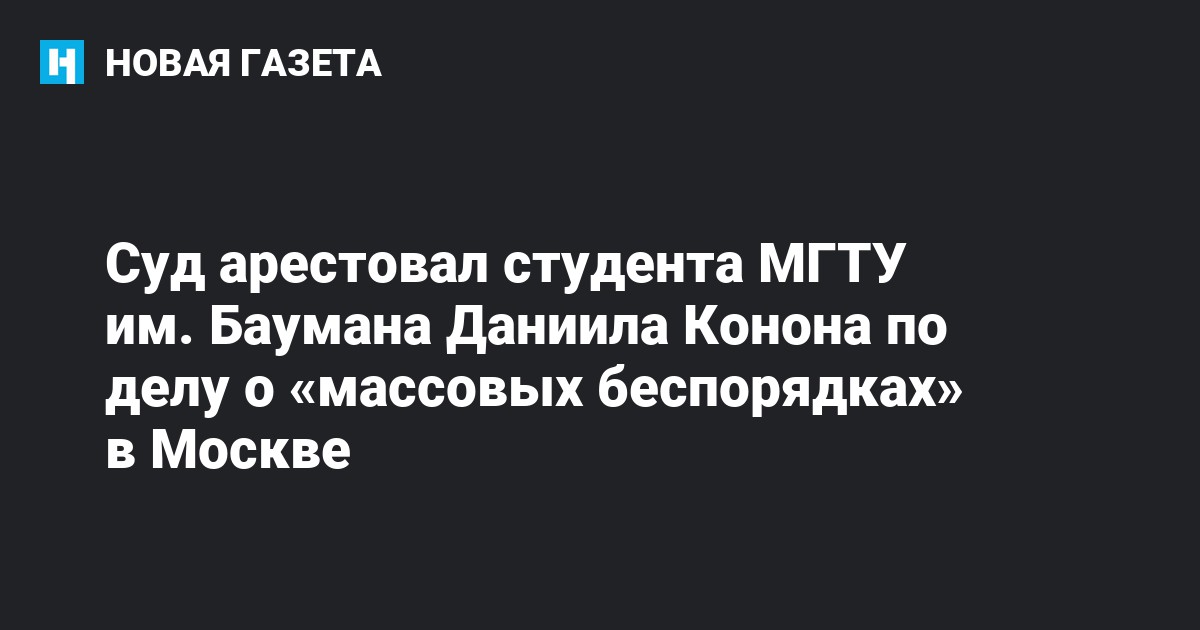 Пресненский районный суд Москвы арестовал до 27 сентября еще одного обвиняемого в массовых беспорядках в Москве на акции 27 июля (ст. 212 УК), сообщает корреспондент «Новой» из зала суда. Это студент МГТУ им. Баумана и сборщик подписей за кандидата в Мосгордуму Ивана Жданова Даниил Конон.
