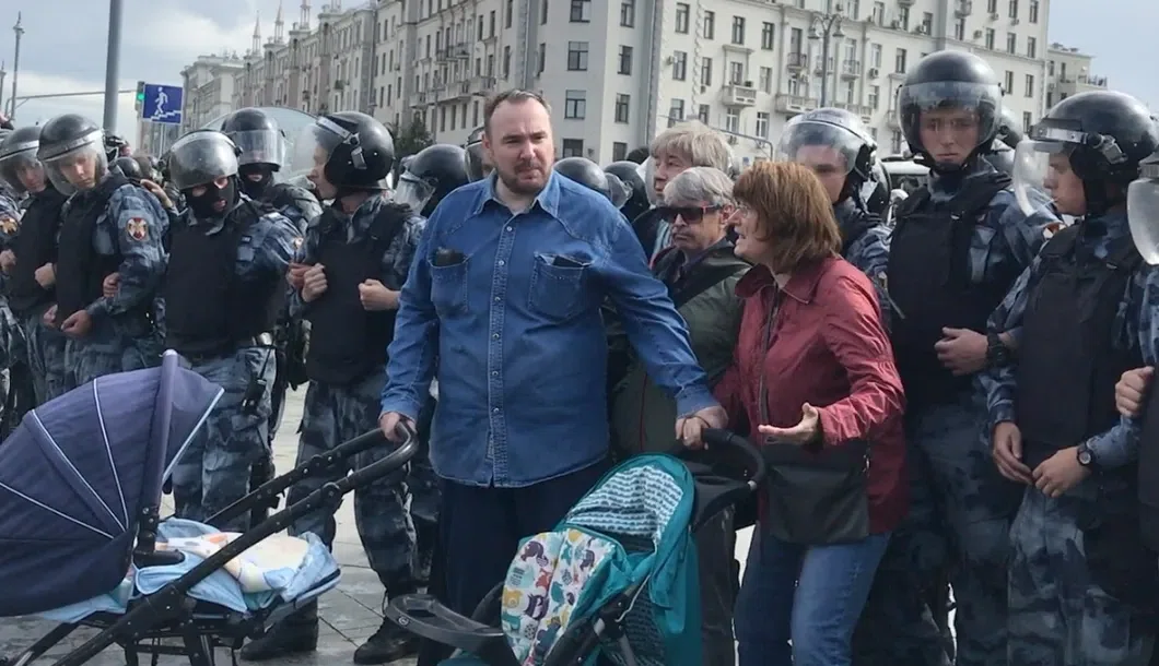 «Мы с женой пошли гулять с детьми по бульварам, останавливались на детских площадках, играли. В какой-то момент мы переходили Тверскую у Пушки, вынырнули с пешеходного перехода, то есть мы не видели, что впереди делается. Просто вышли из перехода и увидели «цепь» из росгвардейцев, которая движется, вытесняя людей с площади. Мы быстро пошли прочь оттуда. В какой-то момент мы оказались между толпой и цепью. Для медиа это была хорошая картинка, и нас все резко стали снимать, и с мобильных телефонов, и с камер. А потом один из этих роликов выложили в Сеть. Мы не стояли ни минуты, двигались и сразу же ушли. Дальше пошли по бульварам и задержались только на следующей детской площадке».