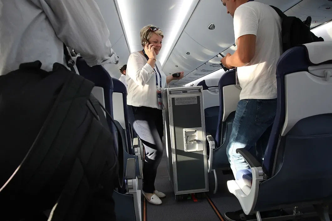 На борту нового самолета чувствуется запах материалов сине-голубой кожаной обивки кресел, яркий солнечный свет освещает салон через непривычно большие иллюминаторы. Внутри современный МС-21 заметно отличается от своих прямых конкурентов Boeing 737 MAX, Airbus A220 и Airbus A320neo. Так, например, проход между рядами как в бизнес-классе, так и в экономе довольно широкий. «Рассчитывали, что в салоне одновременно загружать свои вещи в верхние ящики смогут сразу два человека, стоя спина к спине и не мешая при этом друг другу», — рассказывает девушка-консультант, работающая на неоправданно высоких каблуках и в костюме стюардессы. Она представляет Объединенную авиастроительную корпорацию (ОАК, туда входит разработчик борта — корпорация «Иркут»).