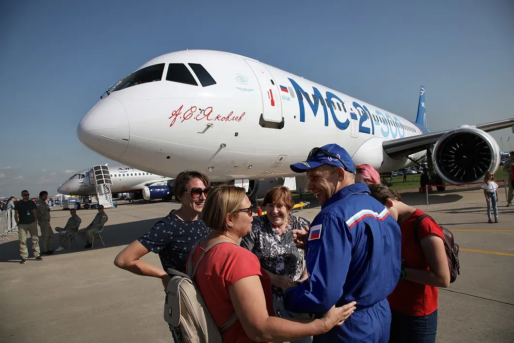 Премьера МС-21-300 стала ключевым событием МАКС-2019. Два самолета, в том числе третий по счету и пока последний лётный образец, на котором установлен пассажирский салон, были показаны на статической стоянке. Ещё один самолёт принял участие в лётной программе. В будущем предполагается выпускать две версии — МС-21-200 (от 132 до 165 мест) и МС-21-300 (от 163 до 211 мест). Также планируется создание версии МС-21-400 (до 250 мест). Базовой версией самолета является МС-21-300 вместимостью до 211 пассажиров и дальностью полетов до 6 тысяч километров. 28 мая 2017 года лайнер совершил первый полет, а серийное производство должно начаться в 2021 году. Сейчас три самолета проходят летные испытания, еще четыре — стендовые.