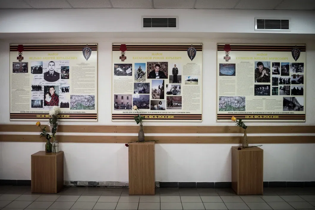 Изображения погибших спецназовцев я встречаю в школе шесть раз: огромные фотографии на фасаде, черно-белые карандашные рисунки в холле, стенды с биографиями и домашними фото в Зале славы на третьем этаже, цветные портреты в коридоре, стенд с фотографиями в Зале памяти школы, алые сердечки с фотографиями и надписью «Вы навсегда в самом сердце Беслана» — в Знаменном зале.