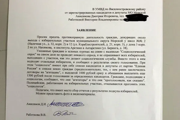 Кандидаты в депутаты от партии «Яблоко» написали заявление в полицию на «социологов» из округа Морской. По мнению «яблочников», под видом опроса у избирателей собирается отчетность о голосовании за деньги. «Граждане, подходящие к социологам сообщают, что они «проголосовали как надо», — отмечают авторы заявления.