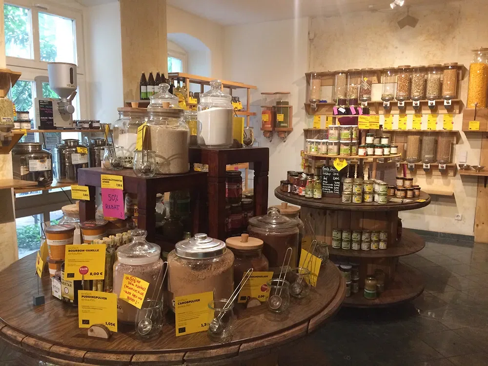 Один из таких магазинов Der Sache Wegen, в переводе с немецкого «По этой причине», находится в берлинском районе Пренцлауер-Берг. На его сайте опубликованы факты о вырубке тропических лесов для производства пальмового масла, о ста миллионах тонн пластика в мировом океане и о преимуществах «биопродуктов». «По этим причинам» Кристине Сиг и Сима Кавиани при помощи кредита, краудфандинга и пожертвований собрали необходимую сумму и открыли магазин в декабре 2017 года.