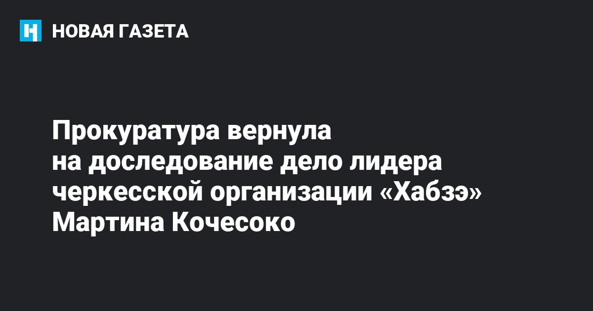 Прокуратура Кабардино-Балкарии вернула на доследование дело главы черкесской организации «Хабзэ» Мартина Кочесоко, которого ранее обвинили в приобретении и хранении наркотиков (ч. 2 ст. 228 УК). Об этом сообщает «МБХ медиа» со ссылкой на адвоката Тимура Хутова.