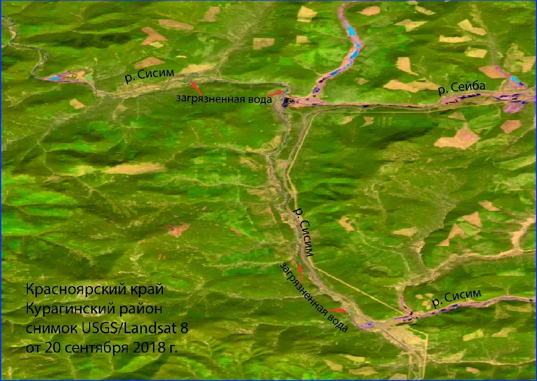 Центр спутникового мониторинга и гражданского контроля (Санкт-Петербург, директор Ольга Чупаченко) год назад дал заключение № 60/24: в ходе анализа космоснимков, полученных средствами дистанционного зондирования Земли, ЦСМиГК выявил (см. документ) на территории Курагинского и Балахтинского районов Красноярского края факты загрязнения водных объектов взвешенными веществами 20 сентября 2018 года. «Наблюдается загрязнение реки Сисим ниже мест золотодобычи. Загрязнение усиливается после впадения в Сисим реки Сейба. Протяженность загрязнения 240 км». Сканированные изображения участка загрязнения прилагались.