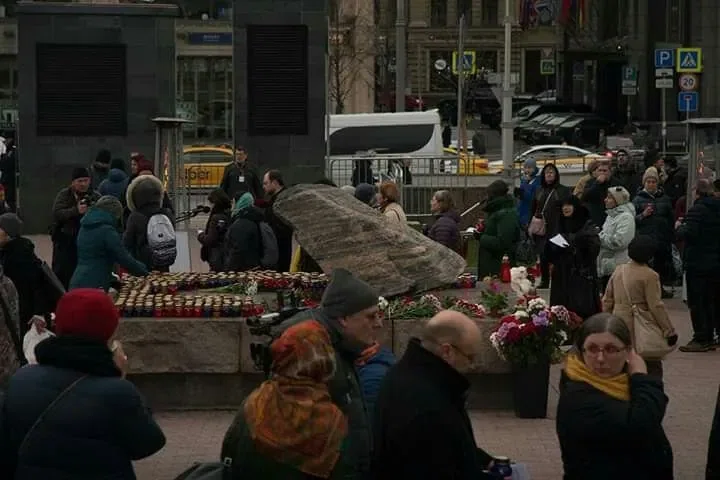 Люди держат в руках свечки, кто-то цветы. Среди пришедших много молодежи. Есть даже те, кто привел с собой маленьких детей. Сотрудники «Мемориала» раздают желающим горячий чай. На площади расставлены специальные обогреватели.