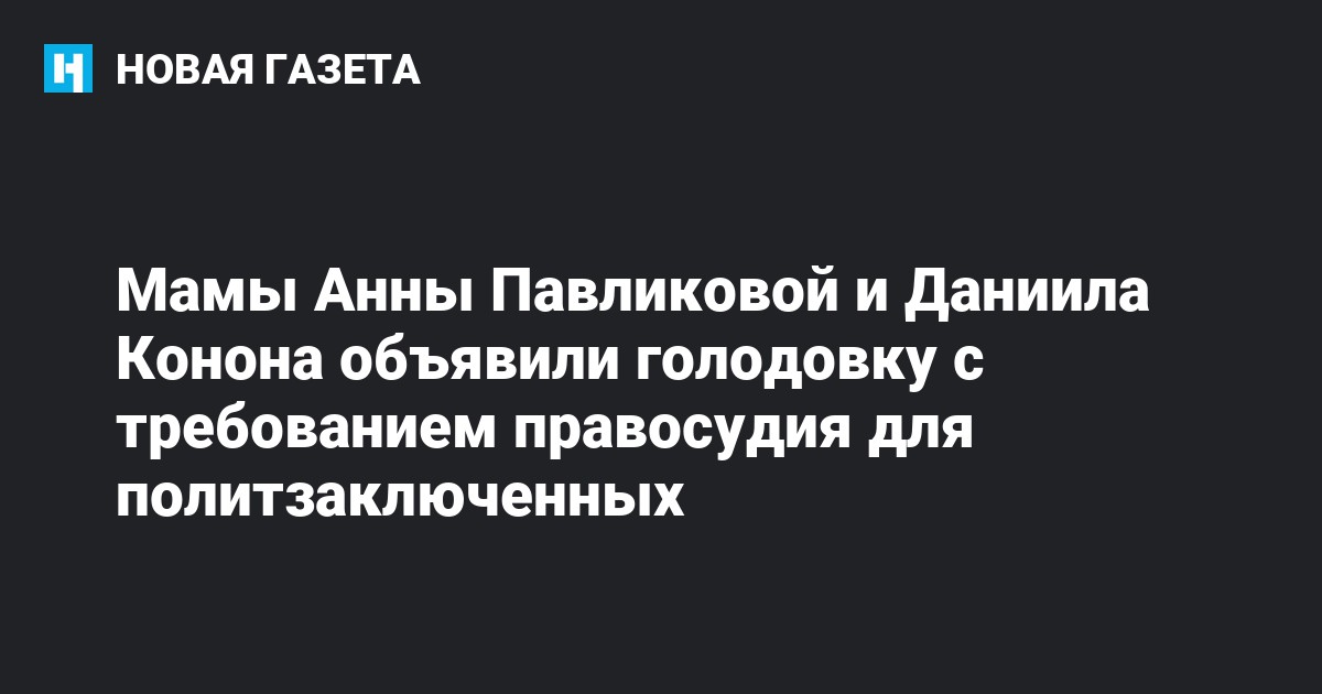 Мать обвиняемой по делу «Нового величия» Анны Павликовой Юлия Виноградова и Наталья Конон — мать проходившего по «московскому делу» Даниила Конона — объявили голодовку из-за несправедливых, на их взгляд, приговоров фигурантам политических дел, в том числе участникам летних московских протестов.
